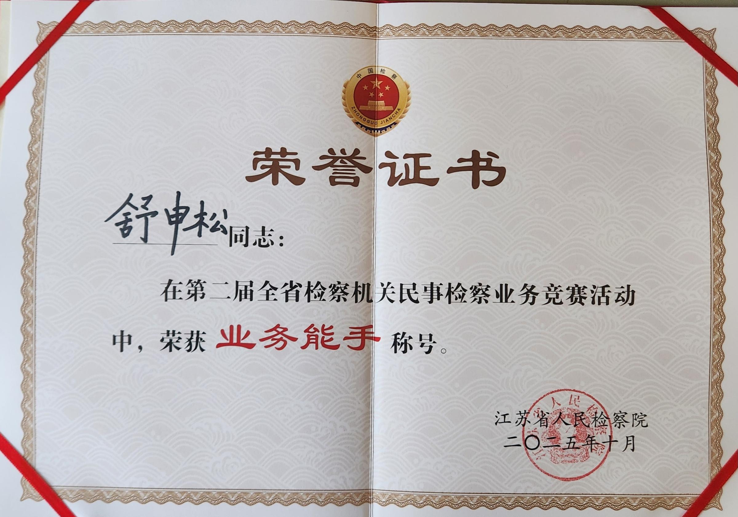 喜讯:丹阳市检察院舒申松同志在第二届全省检察机关民事检察业务竞赛活动中,荣获“业务能手”称号